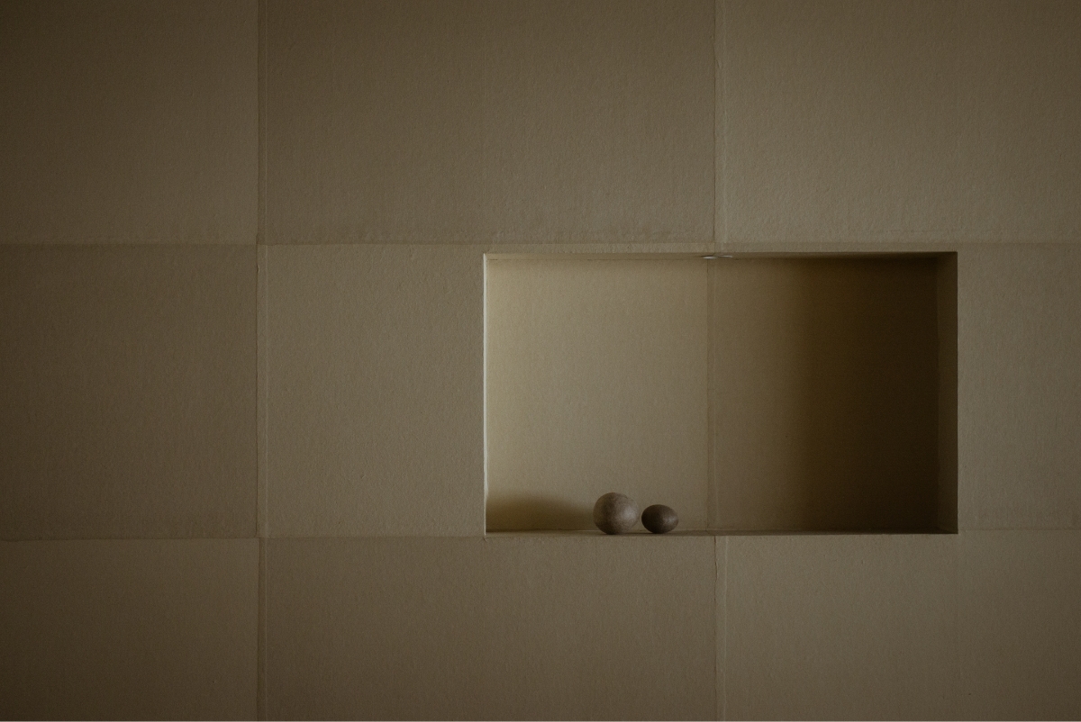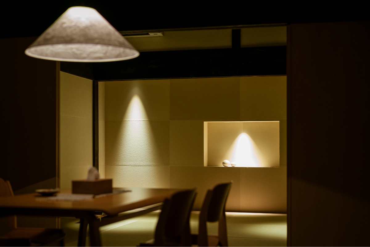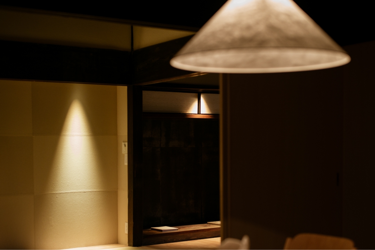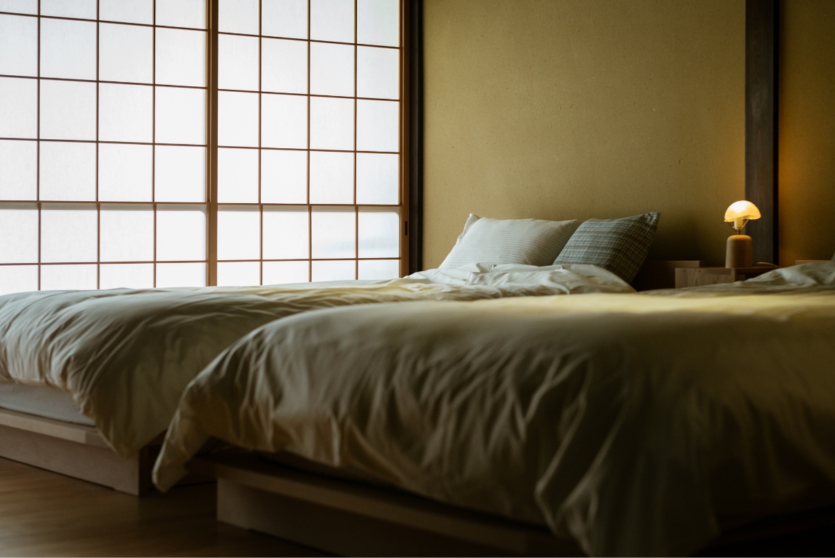 Wataru Hatano, the Ayabe Kurotani washi paper craftsman, constructed the wall of the bedroom with handmade washi, contrasting white and black by reversing the papers. You can feel the shades of color and the soft texture.