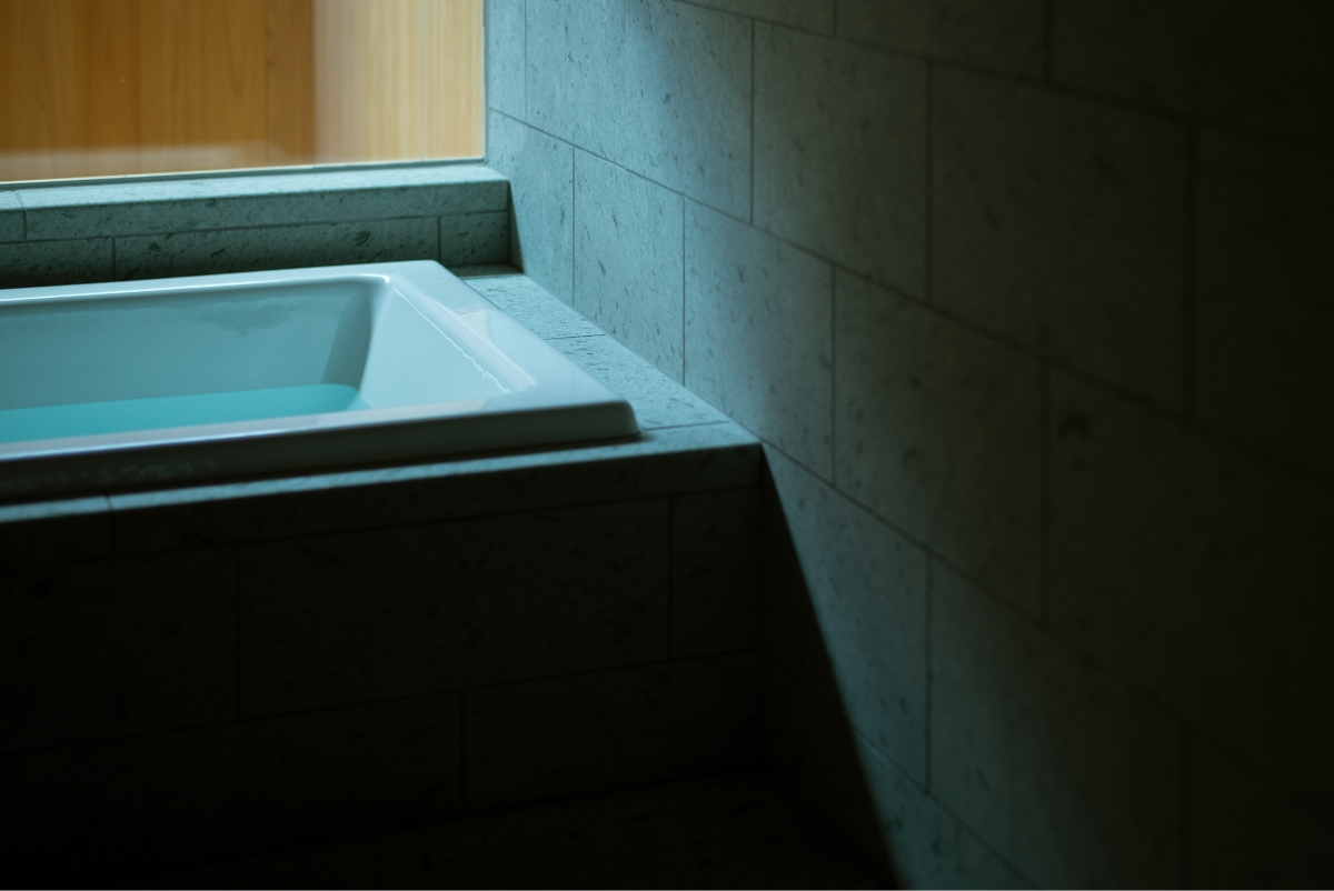 浴室から、洗面・脱衣場にかけて空間を広めにとっております。十和田石を使った浴槽と、オーバーヘッドシャワー、オーガニックアメニティーをご用意しております。開放感のある窓もあり、リラックスできる空間となっています。